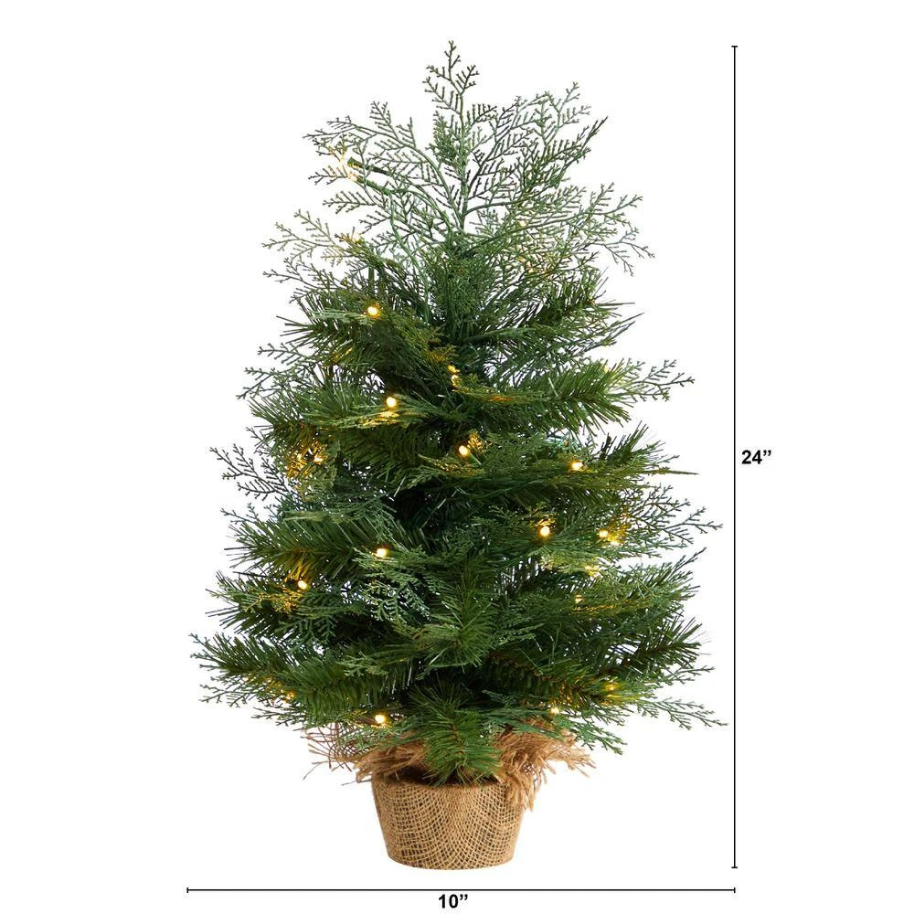Spread Christmas cheer to compact spaces with this Artificial Christmas Tree. Inspired by nature and crafted from high-quality materials, this mini Christmas tree has lifelike bendable branches, allowing you to shape in your space, and add mini ornaments. To save you time and money, the faux tree comes with 35 warm LED lights for a cozy glow, allowing you to illuminate any space for years to come. Standing 2 ft. from a burlap base (included in height) for a rustic touch, add to any desktop. Perfect for a kids’ room, office or mantel. Best of all? Zero maintenance. . Faux Christmas Trees are manufactured using synthetic materials, such as polyester material or plastic, and are well designed and constructed to be life-like in appearance. This item will need to be re-shaped when removed from the secure box to allow it to reach its fullest size. Your artificial Christmas Tree will look beautiful for years to come; simply wipe clean with a soft dry cloth when needed.