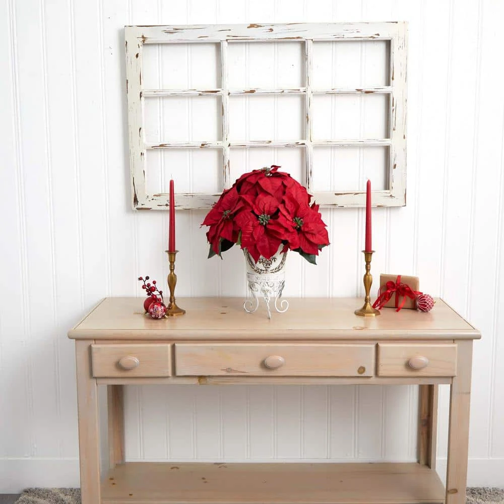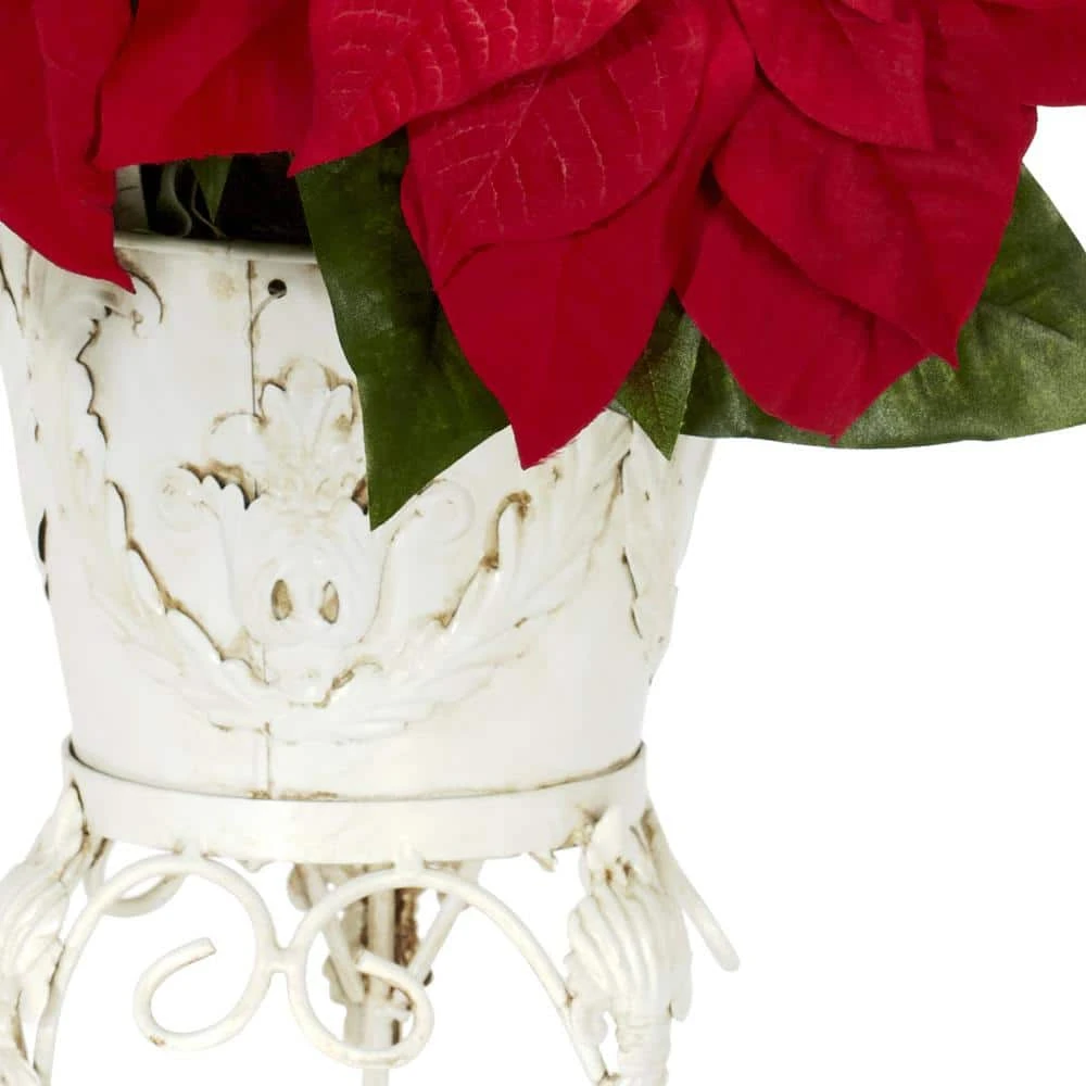 Add some shine to your holiday with this attractive re-creation of a lush poinsettia, held aloft by a beautiful metal planter. The dark reds and verdant greens are perfect accompaniments to the sheen of the metal planter, and together, they just radiate festivity. But one for your home, and several as gifts for those