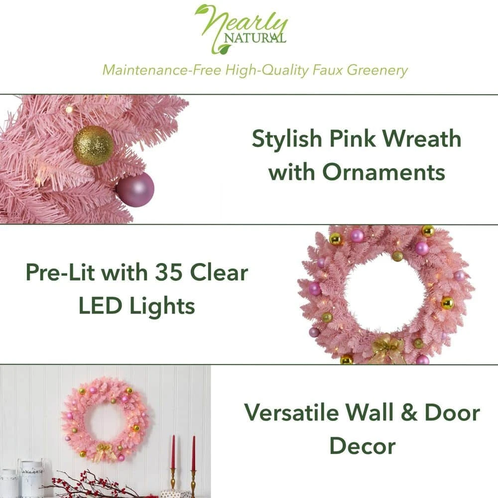 Think pink and light up your favorite seasonal accents while adding serious curb-side appeal with this artificial wreath intricately designed from a collection of pink-inspired foliage, all beautifully flocked in a candy-colored hue. Festively accented with decorative ornaments, finished with a golden, oversize bow at the base, and arriving pre-strung with 35 LED lights to make decorate stress-free, this 24