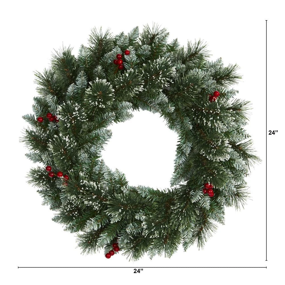 Light up your favorite seasonal accents while adding serious curb-side appeal with this artificial wreath intricately designed from a rich collection of pine foliage, carefully accented throughout with bright red holly berries that look incredibly lifelike – all frosted with a hint of faux snow. Arriving pre-strung with 35 clear LED lights to effortlessly illuminate either a wall or door, this 24