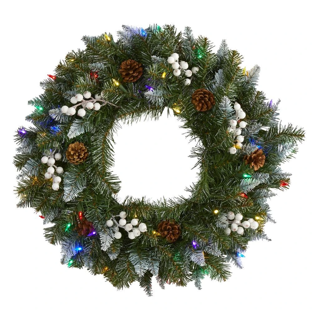 Light up your favorite seasonal accents while adding serious curb-side appeal with this artificial Christmas wreath intricately designed from realistic looking foliage in a palette of seasonal evergreens and accented throughout with faux pinecones that look incredibly realistic – all finished with a light dusting of fake snow. Arriving pre-strung with 50 multi-colored LED lights to effortlessly illuminate either a wall or door, this 24 ft. (in circumference) decorative wreath makes for an inviting accent and will undoubtedly transform any entrance all throughout the holiday season. Silk plants are manufactured using synthetic materials, such as polyester material or plastic, and are well designed and constructed to be life-like in appearance. This item will need to be re-shaped when removed from the secure box to allow it to reach its fullest size. Your artificial plant will look beautiful for years to come; simply wipe clean with a soft dry cloth when needed.