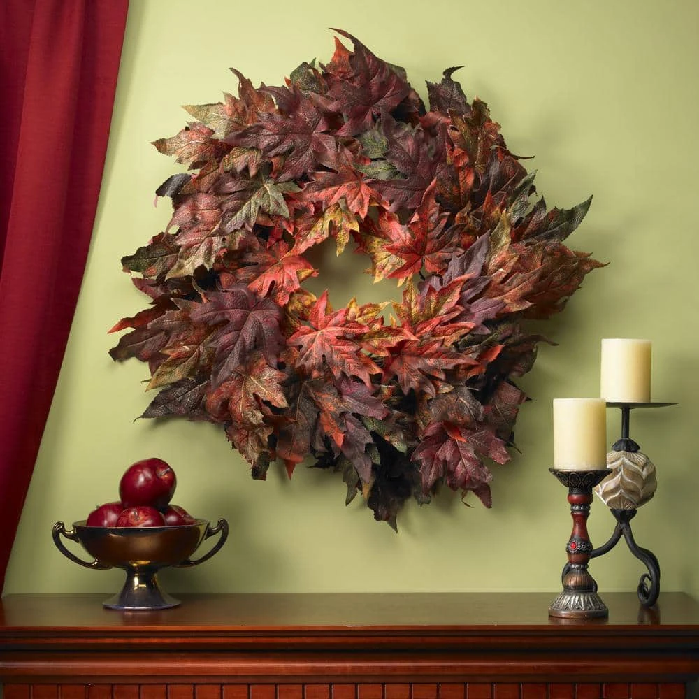 - 30 in. round artificial wreath accented with maple leaves in bright fall colors