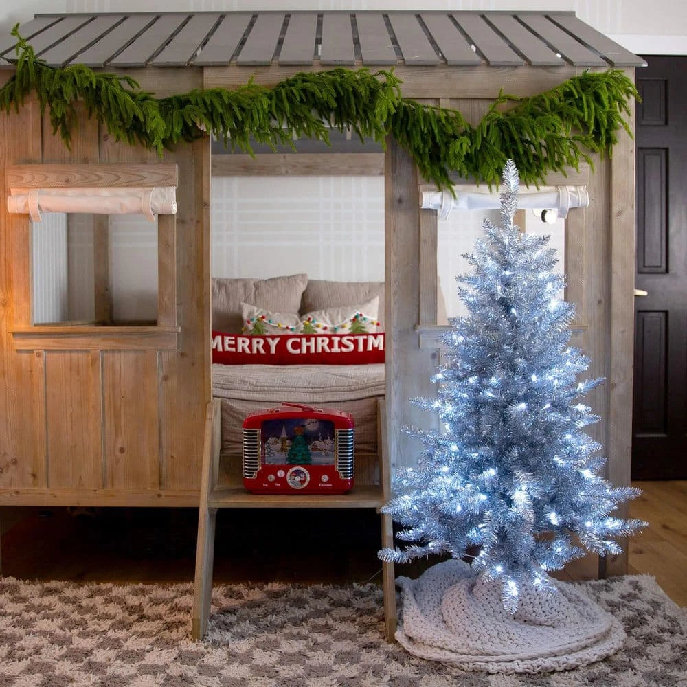 Reminisce on the days of yesteryear where groovy was in and Christmas was en vogue. This artificial silver Christmas tree captures the nostalgic charm of mid-century holiday decor while adding a contemporary cool white LED glow for a modern celebration. Crafted from high-quality materials, the silver finish adds glamour with a vintage twist that complements many decor styles. Pre-strung with 130 cool white LED lights nestled among the tinsel branches, feel the nostalgic radiate your space. Standing 4 ft. from a sturdy stand, create conversation during the holidays. Great for apartments, small spaces, or as secondary trees in larger homes.