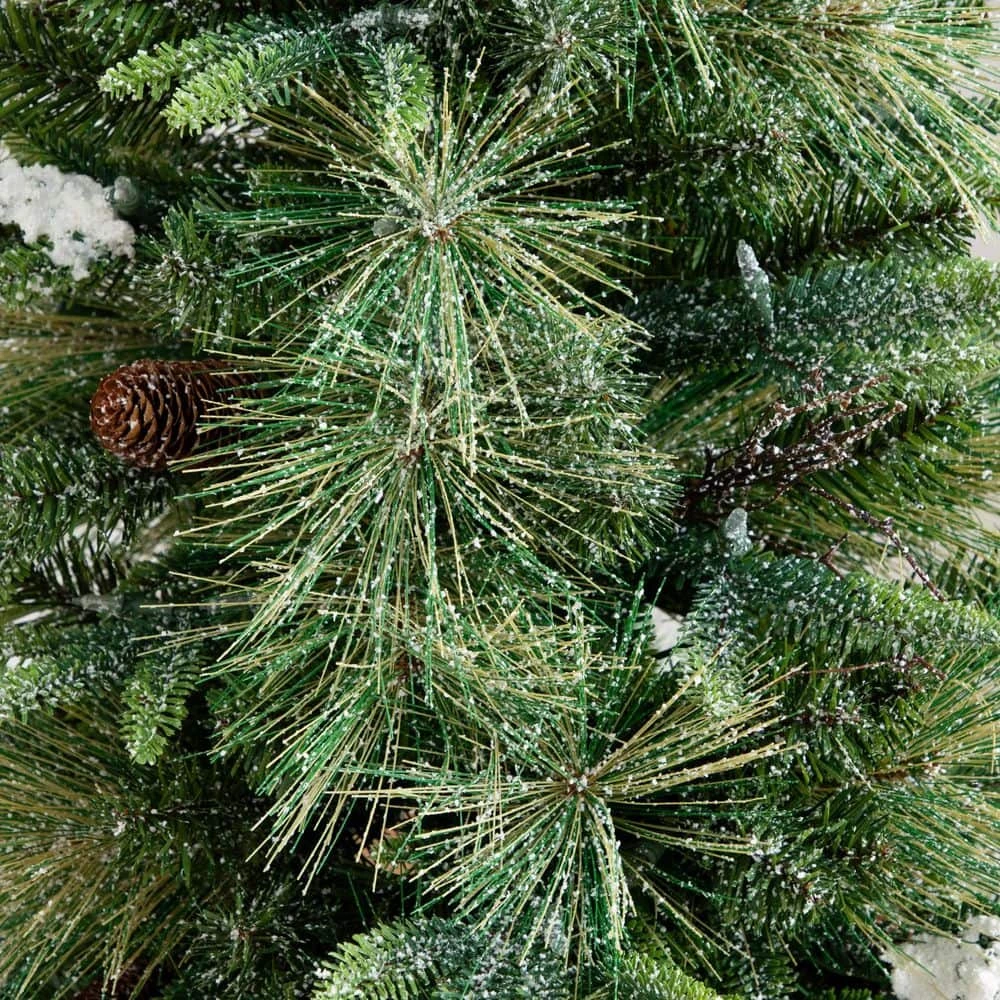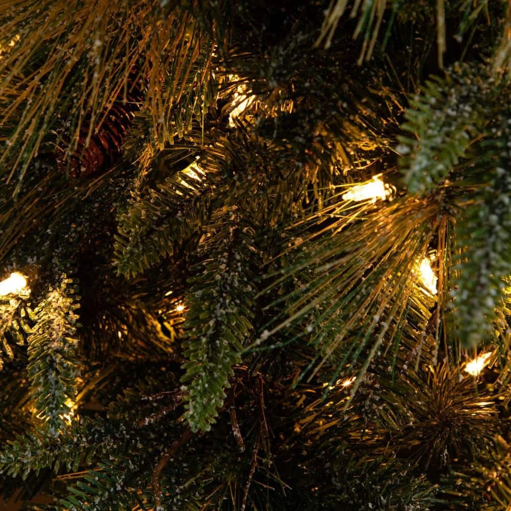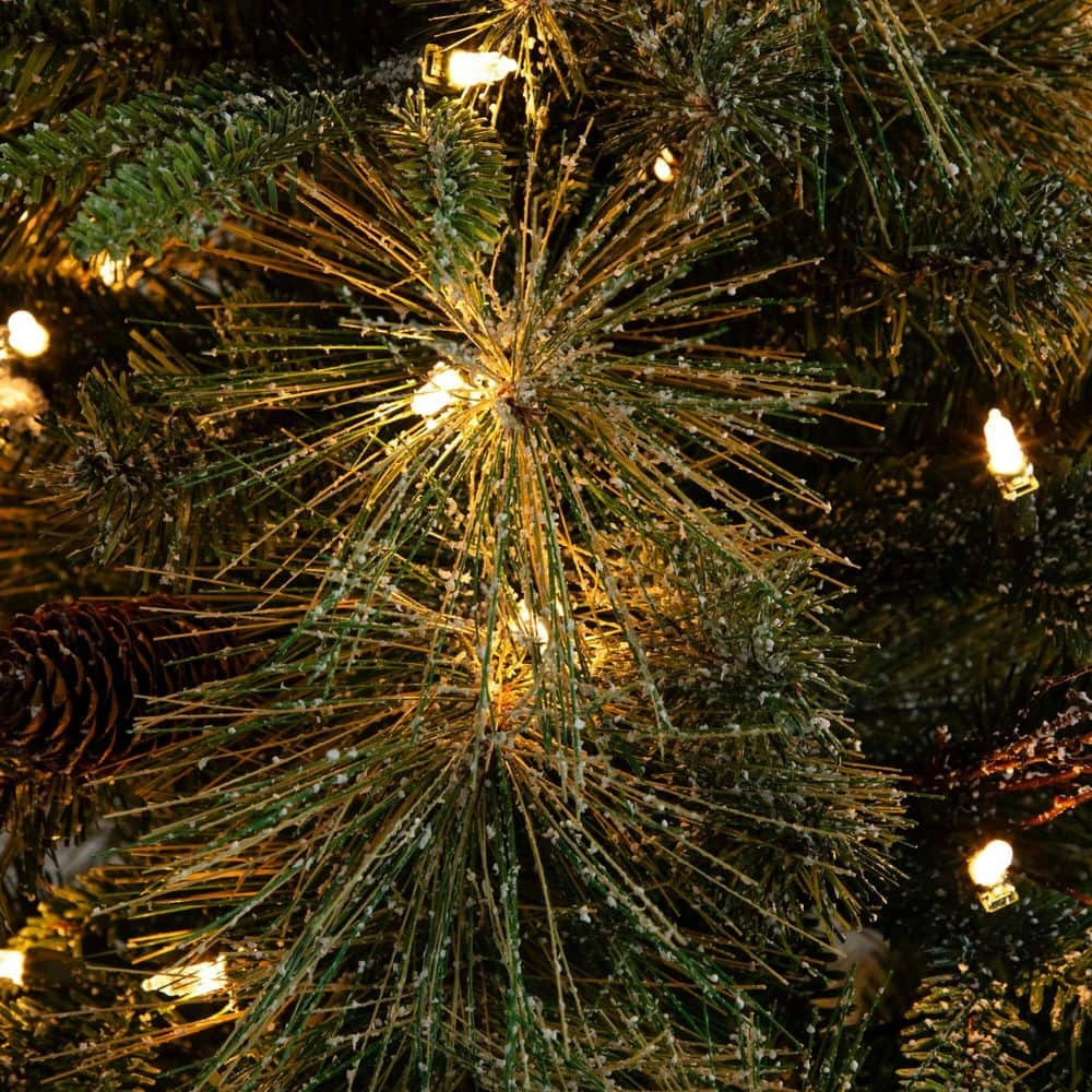 - Pre-lit with 60 energy-efficient warm white LED lights, accented with pinecones and frosted throughout