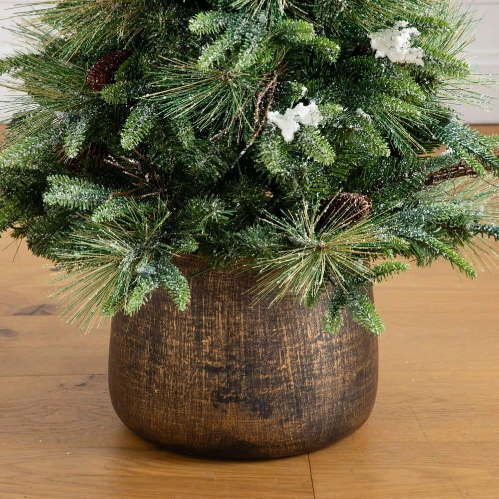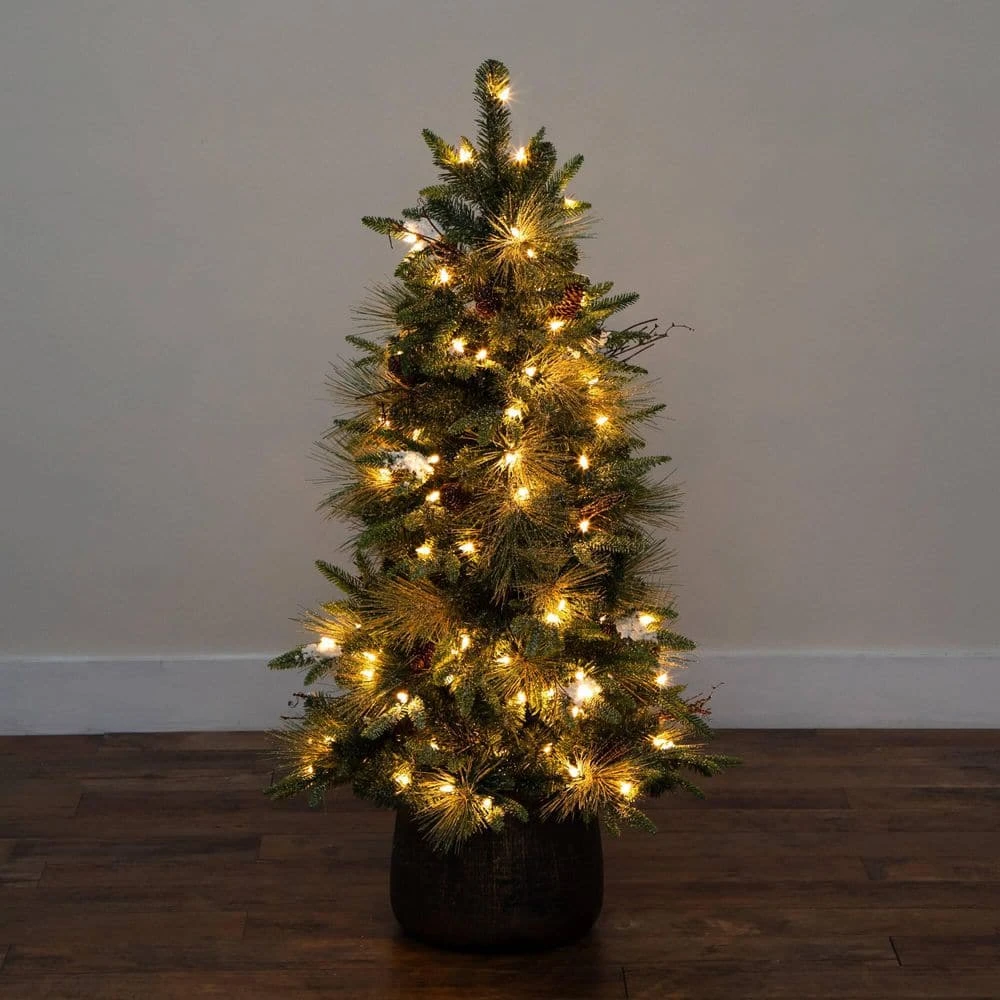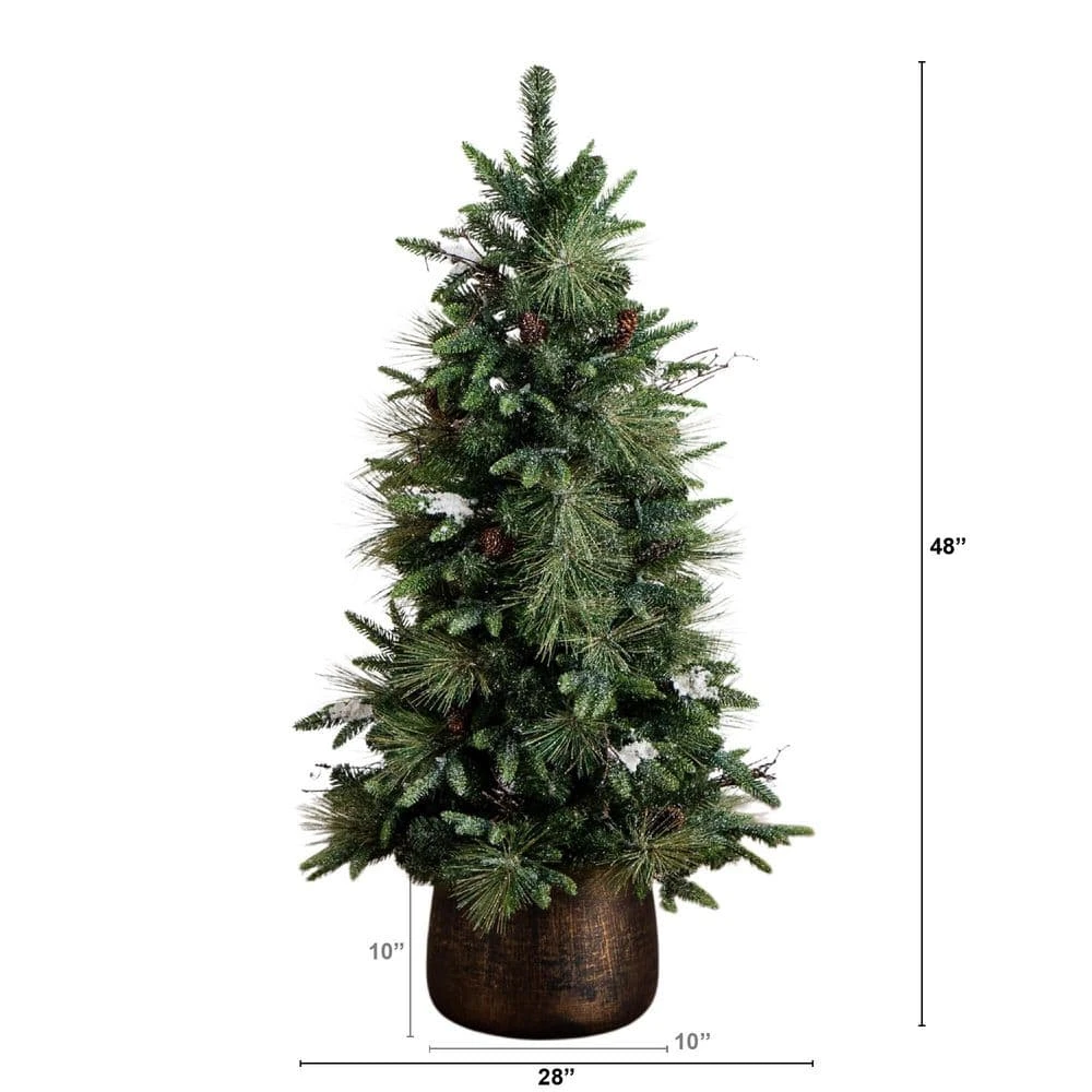 You know that feeling, when it just starts to snow, and the trees have that thin veil of white just on the tips and it looks just right. This artificial mixed pine snowed tree is inspired by a white Christmas, where it snows just enough to capture the rugged nature of the season. Accented with pinecones nestled in between the branches, it’s an organic touch of the outdoors. Remove the guesswork of adding lights, it comes pre-strung with 60 LED lights to provide a warm, inviting glow. Standing 4 ft. from a decorative planter, display in any area, it’s ready to shine. Create a winter scene by pairing multiple trees of varying heights, or let this frosted tree stand alone.