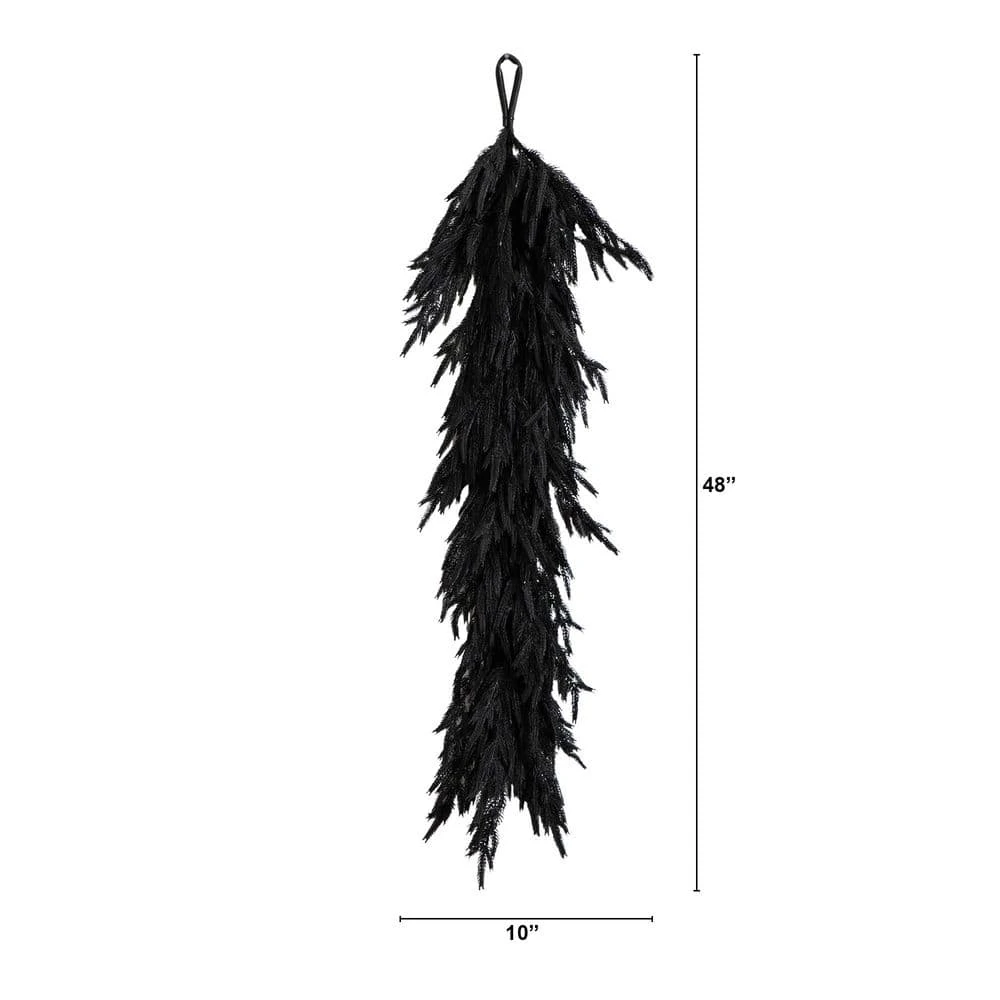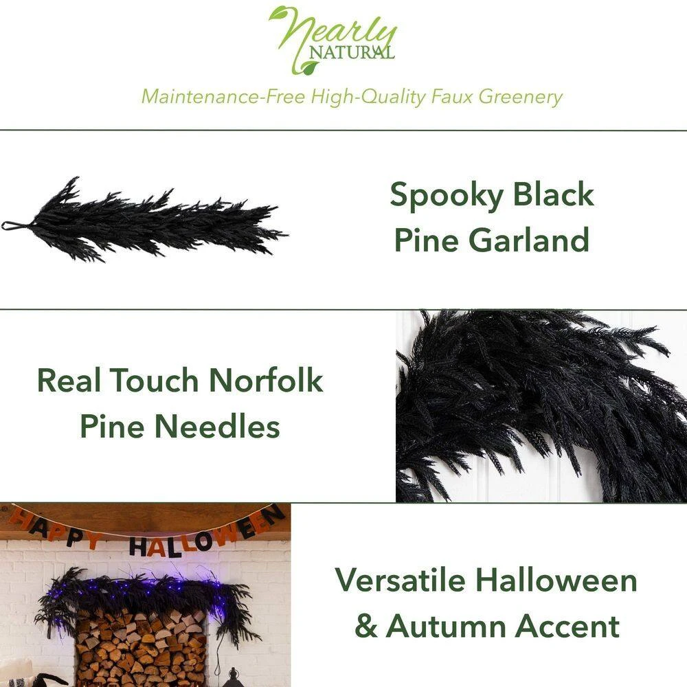 Looking for a spooky yet soft accent during the harvest season? Then you need the artificial Halloween black Norfolk island pine garland. Inspired by the traditional pine that you know and love but updated with a haunting twist, this striking noir garland brings dramatic flair to your Halloween and autumn decor. This sophisticated garland transforms spaces into a bewitching Halloween. Crafted from high-quality materials you’ll notice the attention to detail in its natural look and real touch branches. Bend and shape the lush branches to fit in your space. With a length of 4-Ft, accent spaces such as mantels, doorways or staircases. Sprinkle some pumpkins, lights or other decor pieces for an elevated look.