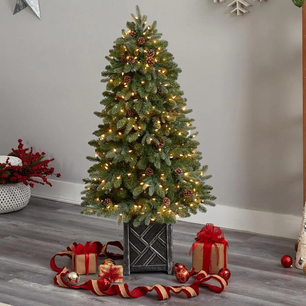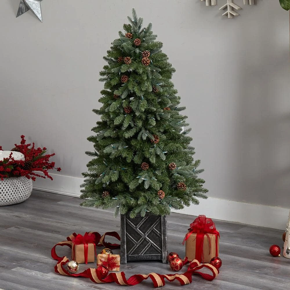 Rock around this flocked Artificial Christmas Tree for a magical holiday season. A silhouette – that mimics the foliage and texture of evergreens – with 514 upward sloping, easy-to-bend branches, can house a symphony of holiday ornaments and decorations. Arriving pre-strung with 300 LED lights to eliminate tangles, set any home aglow in harmony. Housed in a decorative planter, this artificial Christmas tree is 5 ft. high and perfect to display in compact spaces – such as, dorms, kids’ rooms or lonely corners. Faux Christmas Trees are manufactured using synthetic materials, such as polyester material or plastic and are well designed and constructed to be life-like in appearance. This item will need to be re-shaped when removed from the secure box to allow it to reach its fullest size. Your artificial Christmas Tree will look beautiful for years to come. simply wipe clean with a soft dry cloth when needed.