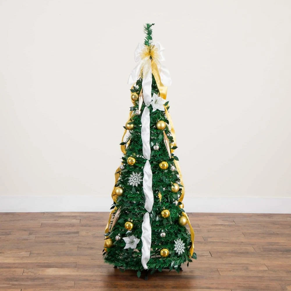 Add a touch of festive elegance to your space with the dazzling 5 ft. pre-lit artificial pop-up Christmas tree. Adorned with gold and silver ornaments, shimmering ribbons, and an evergreen silhouette, this tree exudes a sophisticated holiday charm that will bring the magic of the season into any room. 100 warm white LED lights twinkle through the lush branches, casting a cozy and inviting glow. Its sleek, full shape strikes the perfect balance between classic elegance and modern flair, making it ideal for creating a stylish holiday display. The best part is its easy-to-install design. Not only does it come pre-lit and pre-decorated, but its simple pull-down mechanism makes it the most effortless Christmas tree on the market. Easy to Install: This tree features a convenient pull-down design for hassle-free setup. Simply start by assembling the stand, then gently place the tree on top. Pull the tree down from top to bottom, plug it in, and adjust the ornaments and ribbons to your liking. In just a few minutes, your fully decorated, pre-lit tree will be ready to spread holiday cheer with ease.