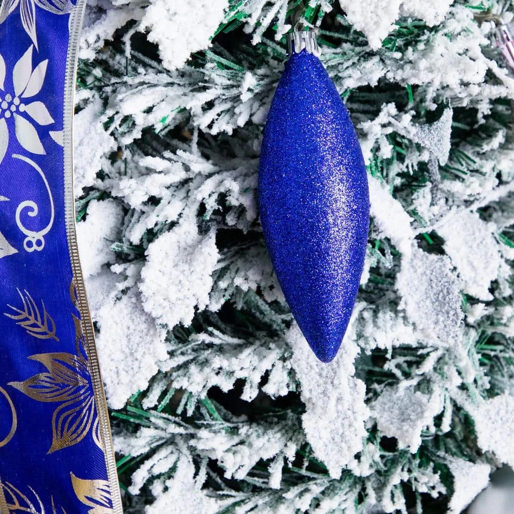 - Come pre-lit with 100 warm white LED lights and pre-decorated with silver and blue ornaments and ribbons