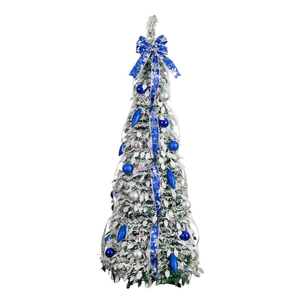 Add a touch of festive elegance to your space with the dazzling 5 ft. pre-lit artificial pop-up flocked Christmas tree. Adorned with silver and blue ornaments, shimmering ribbons, and a frosted flocked finish, this tree exudes a winter wonderland vibe that will bring holiday magic to any room. 100 warm white LED lights twinkle through the flocked like branches, casting a cozy, inviting glow. The sleek, full shape makes it the perfect balance of classic charm and modern flair, ideal for creating a sophisticated holiday display. The best part is its easy-to-install ability. Not only does it come pre-lit and pre-decorated, but its simple pull-down design makes it the most effortless Christmas tree on the market. Easy to Install: This tree features a convenient pull-down design for hassle-free setup. Simply start by putting together the stand, then gently place the tree on top. Pull the tree down from top to bottom, plug it in, and adjust the ornaments and ribbons to your liking. In just a few minutes, your fully decorated, pre-lit tree will be ready to spread holiday cheer with ease.