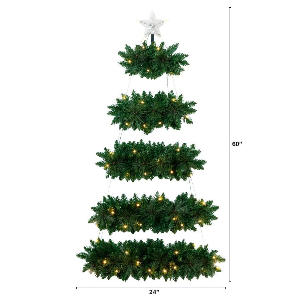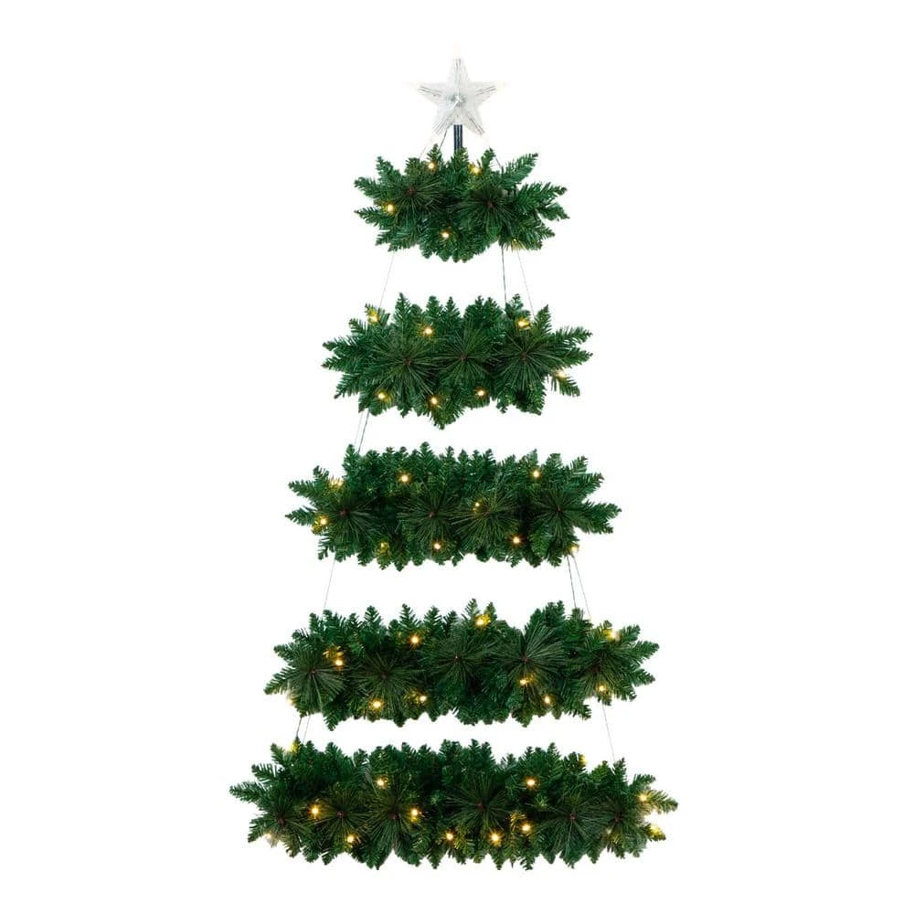 Looking for the perfect space-saving solution for the holidays Meet our new wall-hanging Christmas tree, designed for those hard-to-decorate areas. Think of it as a lighted garland Christmas tree with everything you need for a festive celebration. Pre-lit with 50 energy-efficient LED lights, this battery-operated tree fits seamlessly into any room, regardless of size. Standing 5 ft. tall from top to bottom, it invites creativity-add ornaments, letters, trinkets and other accents to make it truly yours. Display in a studio, cozy nook, as a 2nd Christmas tree, apartment, dorm and other spaces.