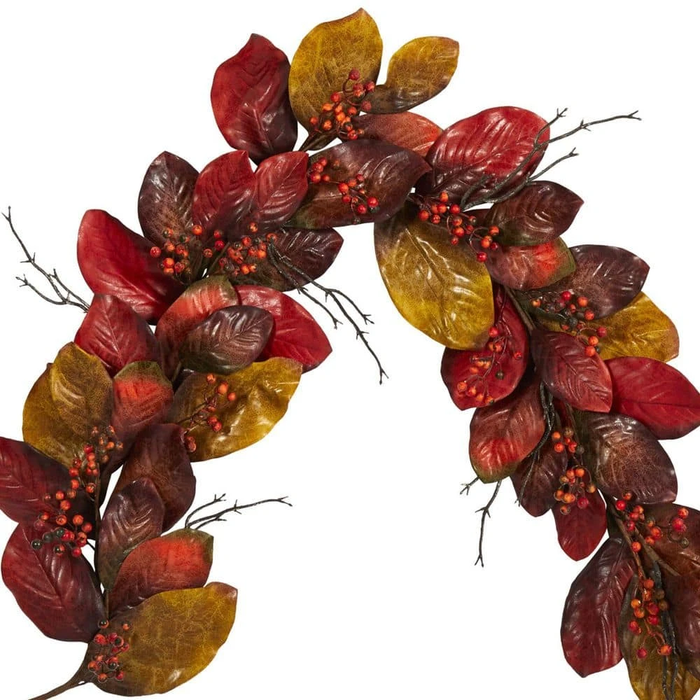 Inject explosive fall coloring throughout everyday spaces with the help of this artificial garland. Intricately designed with realistic looking magnolia leaves in fiery, seasonal colors, it comes accented with sprays of faux berries that look incredibly lifelike. Perfect for sprucing up a bare mantle, counter, or banister, this 6 ft. L decorative garland would undoubtedly make a handsome holiday accent wherever displayed. Complete your decor scheme with a complementary matching teardrop. Silk plants are manufactured using synthetic materials, such as polyester material or plastic, and are well designed and constructed to be life-like in appearance. This item will need to be re-shaped when removed from the secure box to allow it to reach its fullest size. Your artificial plant will look beautiful for years to come; simply wipe clean with a soft dry cloth when needed. About Nearly Natural Inc. – For over 75-years, Nearly Natural Inc. has been providing conscientious consumers with beautiful alternatives to natural decorations. Employing and advised by naturalists who understand the live plant world, Nearly Natural is able to recreate the most realistic-looking decorative items for homes, offices, and businesses. Driven by a true commitment to customer service, attention to detail, and natural philosophy, Nearly Natural strives to bring customers the most beautiful, unique, and striking faux plants and floral on the market.