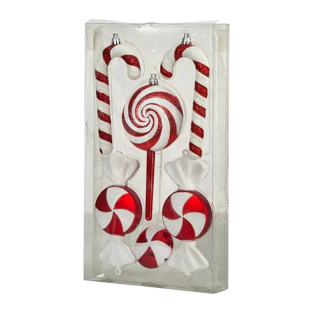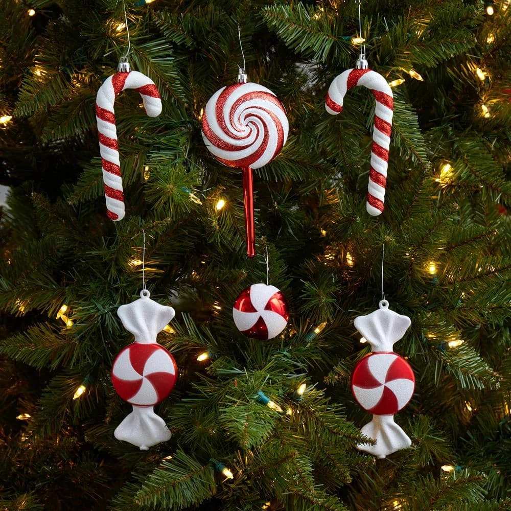 Are you foodie? Have a sweet tooth? Make your Christmas tree a little sweeter with this Christmas candy-inspired ornament set of 6. Fill any bare corner and create a focal point wherever displayed. Easily brighten any corner of your Christmas tree. Includes 2 candy canes, 1 lollipop and 3 packs of candies.