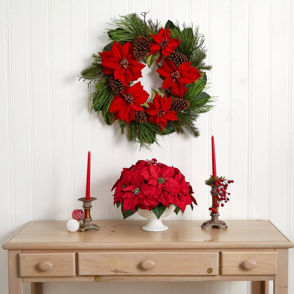 This artificial poinsettia arrangement has carefully hand-crafted blooms that are in beautiful contrast to the bed of deep green leaves. Situated in a white urn, it would look stunning as a centerpiece on your kitchen table, not only for your holiday gatherings, but all year long. The deep red of this artificial poinsettia arrangement really pops with the white of the included urn. Make it the centerpiece on your kitchen table for your next holiday get-together.